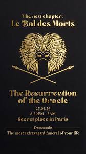 Dix ans après sa dernière fête publique (Venise sous Paris), l’agence We Are The Oracle s’apprête à relancer son concept de soirée spectaculaire avec le Bal des Morts. Au crépuscule du samedi 25 avril, l’Oracle appellera les plus grands amateurs de fêtes d’exception à le suivre sur le chemin d’un manoir digne de la famille Addams, en plein Paris, dont le nom sera dévoilé ultérieurement. A l’image du Bal des Doges à Venise, du Burning Man ou des Fêtes Galantes du château de Versailles, le Bal des Morts s’adresse à un public d’esthètes pour qui la fête et le costume sont un véritable art de vivre.